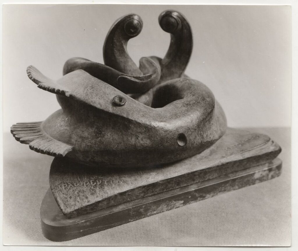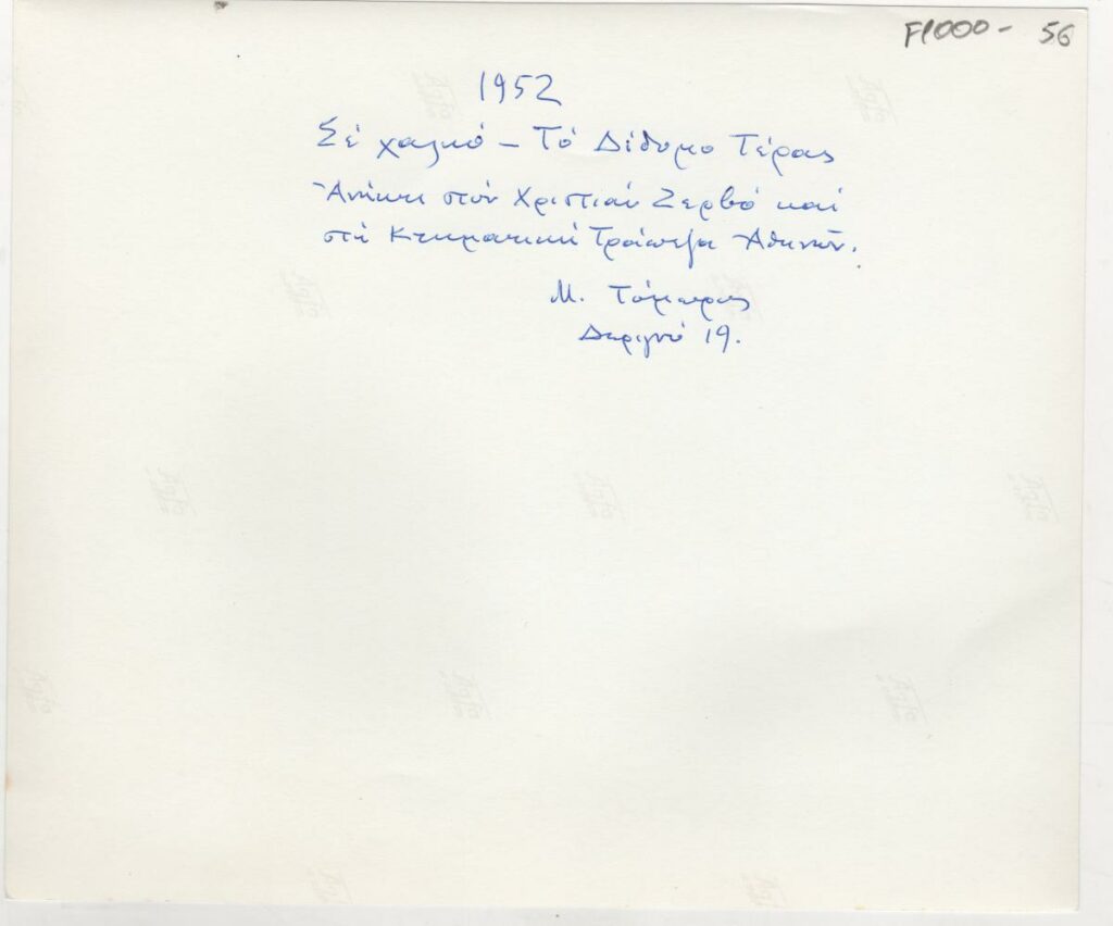 Ασπρόμαυρη εκτυπωμένη φωτογραφία έργου του Μιχάλη Τόμπρου. Στην πίσω όψη, επιγραφές.