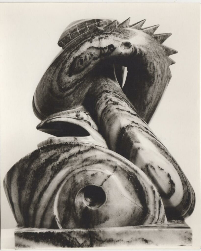 Ασπρόμαυρη εκτυπωμένη φωτογραφία έργου του Μιχάλη Τόμπρου. Στην πίσω όψη, επιγραφές.