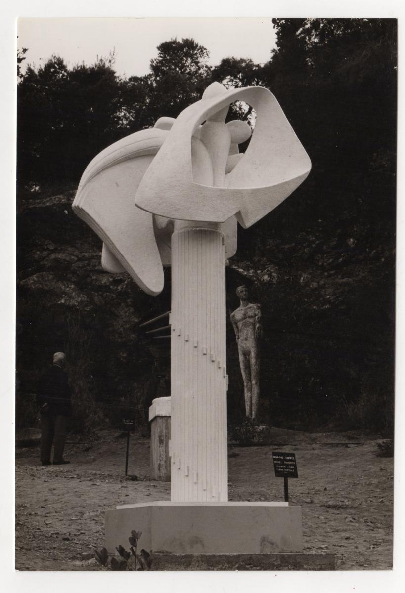 Ασπρόμαυρη εκτυπωμένη φωτογραφία έργου του Μιχάλη Τόμπρου. Στην πίσω όψη, επιγραφές.