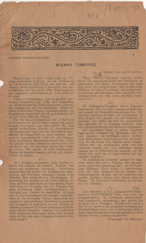 Απόκομμα του περιοδικού “Νέα Εστία”, όπου δημοσιεύεται μετάφραση κειμένου αναφερόμενου στο εικαστικό έργο του Μιχάλη Τόμπρου.