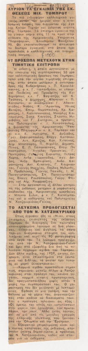 Απόκομμα της εφημερίδας “Τα Νέα” (10/03/1959) δημοσίευσης κριτικής αναδρομικής έκθεσης του Μιχάλη Τόμπρου στην Αθήνα, η οποία διοργανώνεται για τα πενήντα χρόνια καλλιτεχνικής δραστηριότητάς του. Αναγράφονται τα ονόματα των συμμετεχόντων στην τιμητική και οργανωτική επιτροπή καθώς επίσης επισημαίνεται η κυκλοφορία σχετικού λευκώματος, με πρόλογο του Ν. Χατζηκυριάκου-Γκίκα.