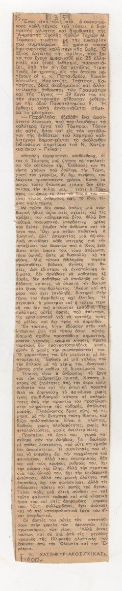 Απόκομμα εφημερίδας (11/03/1959) δημοσίευσης αναφερόμενης σε τιμητική έκθεση έργων του Μιχάλη Τόμπρου, η οποία διοργανώνεται στην Αθήνα, στο πλαίσιο εορτασμού 50 χρόνων καλλιτεχνικής του δραστηριότητας. Δίνεται απόσπασμα από το λεύκωμα που κυκλοφόρησε με κείμενο του Ν. Χατζηκυριάκου-Γκίκα.
