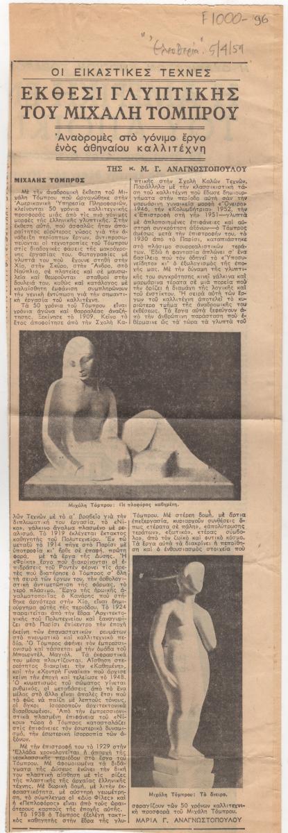Απόκομμα της εφημερίδας “Ελευθερία” (05/04/1959), όπου δημοσιεύεται κριτική αναδρομικής έκθεσης έργων του Μιχάλη Τόμπρου, η οποία διεξάγεται στην Αμερικανική Υπηρεσία Πληροφοριών στην Αθήνα.