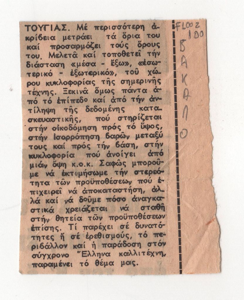 Απόκομμα, έντυπο, χαρτί, 8,5×5,5 εκ., όπου δημοσίευεται κριτική της Ελένης Βακαλό για τον Γιώργο Τούγια. Δεξιά, επιγραφή.