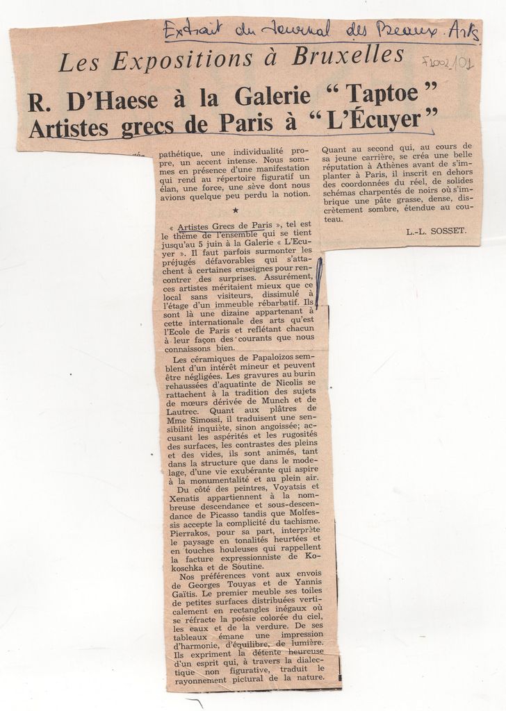Απόκομμα, έντυπο, χαρτί, 23,6×16,5 εκ., όπου δημοσιεύεται, στα γαλλικά, κριτική του L.-L. Sosset για την ομαδική έκθεση ελλήνων καλλιτεχνών στις Βρυξέλλες το 1956. Επάνω, επιγραφή.