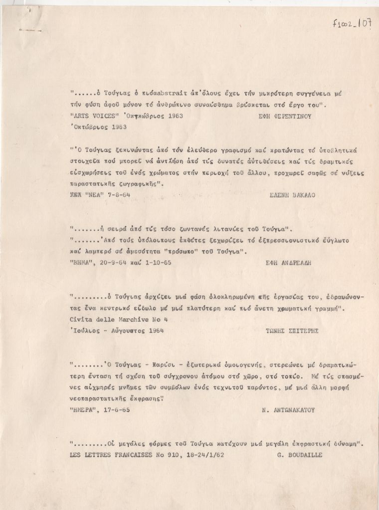 Κείμενο, δακτυλόγραφο, στα ελληνικά, χαρτί, 6 φύλλα, 28,5×21,5 εκ. Αποδελτιώσεις αποσπασμάτων κριτικών για τον Γιώργο Τούγια από τον ελληνικό και τον ξενόγλωσσο τύπο (μεταφρασμένα). Αποδελτιώνονται οι εξής πηγές: “Le Monde” (24/03/1961), “Arts” (05-11/04/1961), “Cimaise” (05-06/1961), “Les Lettres Françaises” (φύλλο 910, 18-24/01/1962), “Arts Voices” (10/1963), “Τα Νέα” (07/08/1964), “Civiltà Delle Macchine” (07-08/1964), “Το Βήμα” (20/09/1964), “Ημέρα” (17/06/1965), “Το Βήμα” (01/10/1965), “Πειραϊκή Πατραϊκή” (τεύχος 151, 1970), “Τα Σημερινά” (05/02/1970), “Η Βραδυνή”, (16/02/1970), “Φιλελεύθερος – Κύπρος” (05/1970), “Ελληνικός Βορράς” (06/07/1970), “Θεσσαλονίκη” (02/1970), “La Sonda” (τεύχος 03, 03/1970), “Al 2” (06-08/1970), “Ακρόπολις” (09/10/1971), “Ημερήσιος Κήρυξ” (04/12/1971), “Ελεύθερος Κόσμος” (13/02/1972), “Νέα Πολιτεία”, (14/02/1972), “Αρχιτεκτονικά Θέματα” (02/1971), “Art Explorers” (τεύχος 1, 1972), “Το Βήμα” (20/01/1972), “Δημιουργίες” (τεύχος 315, 02/1972).