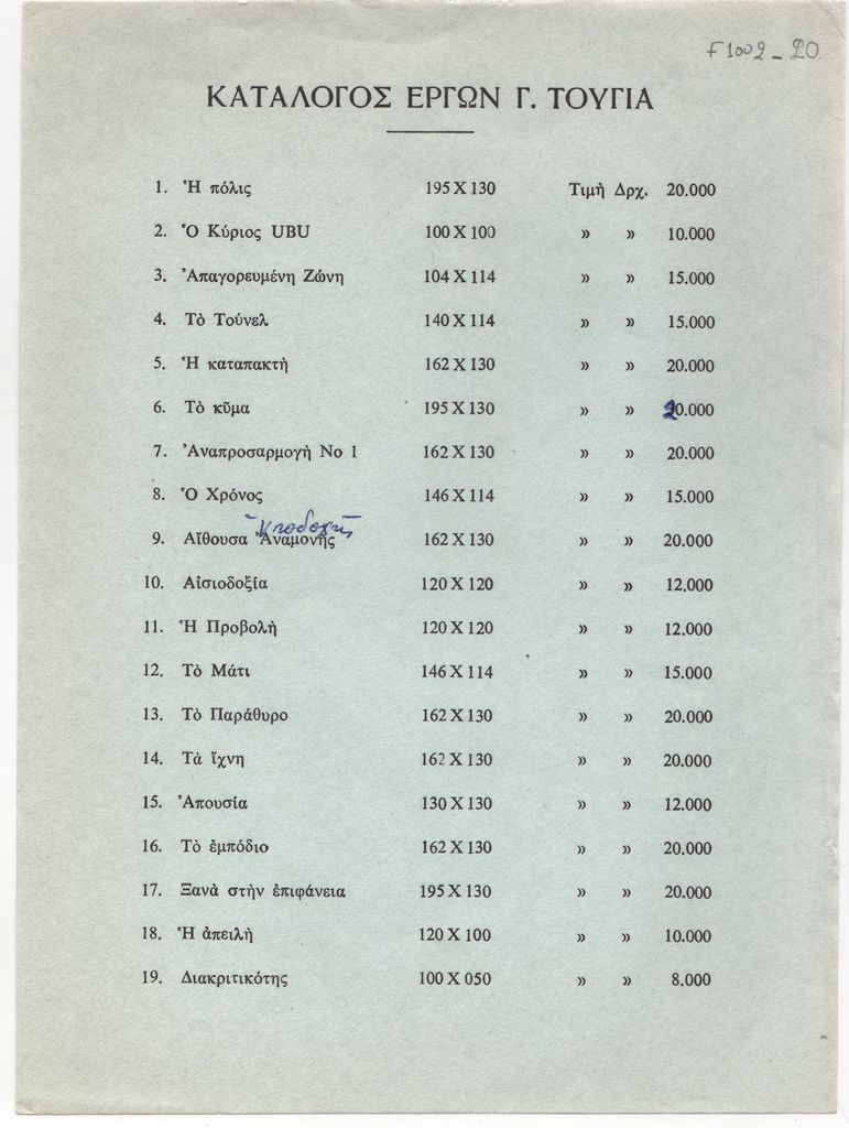 ‘Εντυπο, στα ελληνικά, χαρτί, 23,0×17,0 εκ. Τιμοκατάλογος έργων της ατομικής έκθεσης του Γιώργου Τούγια στην Αθήνα το 1970.