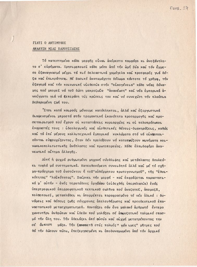 Κείμενο, στα ελληνικά, δακτυλόγραφο, χαρτί, 2 φφ., 28,8×21,3 εκ. Κείμενο σχολιασμού της έκθεσης “Αντίμυθος” του Γιώργου Τούγια σε μουσική του Αργύρη Κουνάδη στην Αθήνα το 1974.