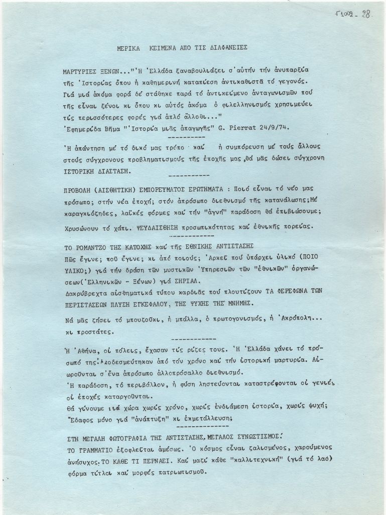 Κείμενο, στα ελληνικά, δακτυλόγραφο, χαρτί. Καταγραφή μερικών από τα κείμενα που συνοδεύουν τις διαφάνειες της έκθεσης “Αντίμυθος” του Γιώργου Τούγια με μουσικό σχολιασμό του Αργύρη Κουνάδη στην Αθήνα το 1974.