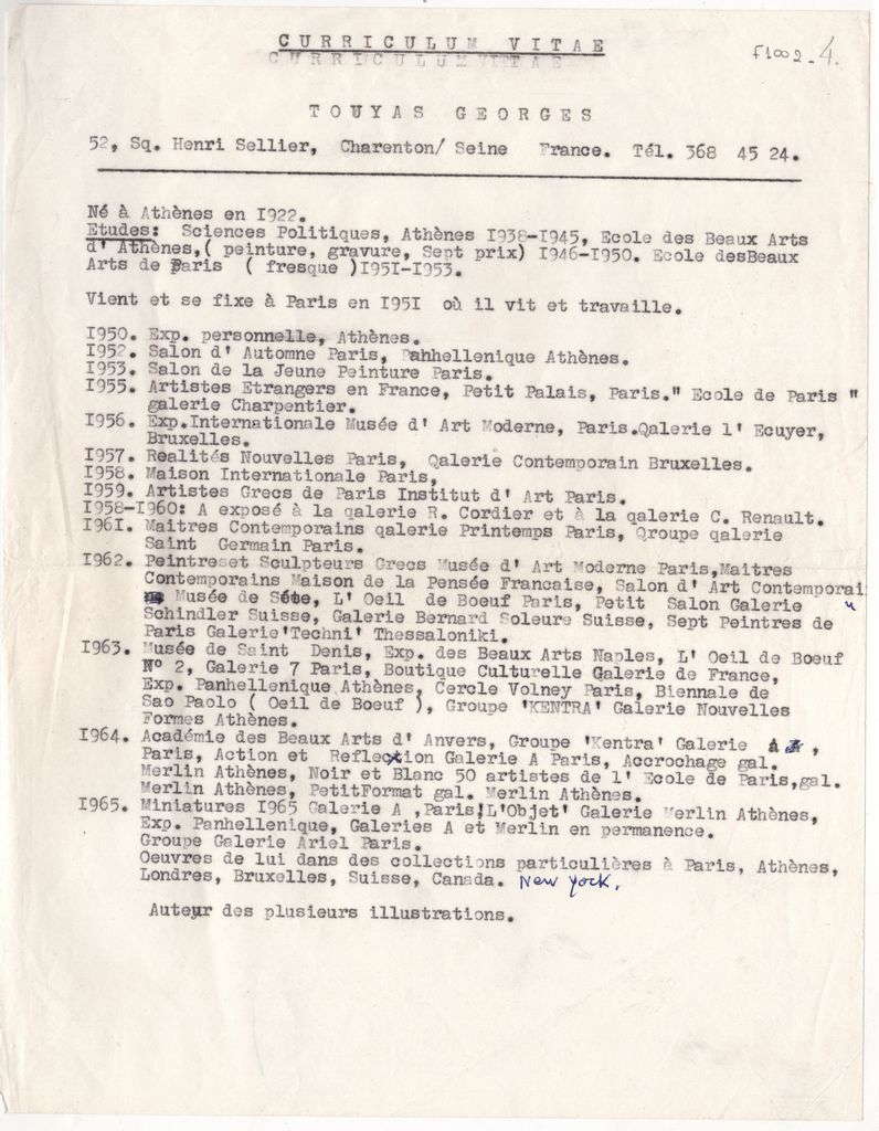 Κείμενο, δακτυλόγραφο, στα γαλλικά, χαρτί, 28,0×21,0 εκ. Βιογραφικό σημείωμα του ζωγράφου Γιώργου Τούγια. Περιλαμβάνονται πληροφορίες για τις σπουδές του καλλιτέχνη και χρονολογικά οργανωμένος κατάλογος εκθέσεων.