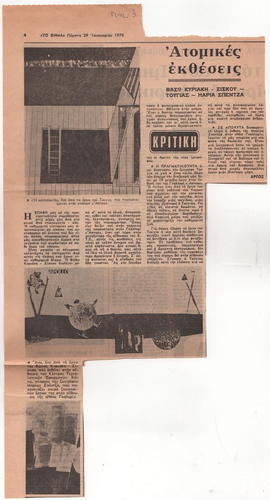 Απόκομμα, έντυπο, χαρτί, 38,3×20,6 εκ., όπου δημοσιεύεται, στα ελληνικά, κριτική του Άργου για τις ατομικές εκθέσεις της Βάσως Κυριάκη-Σίσκου, του Γιώργου Τούγια και της Μαρίας Σπέντζα στην Αθήνα το 1970.