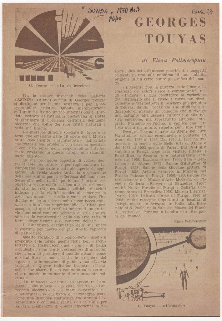 Φωτοαντίγραφο αποκόμματος, έντυπο, χαρτί, 29,7×20,7 εκ., όπου δημοσιεύεται, στα ιταλικά, κριτική της Έλενας Πολυμεροπούλου για την ατομική έκθεση έργων του Γιώργου Τούγια στην Αθήνα το 1970. Επάνω, σημείωση με τα στοιχεία της δημοσίευσης.