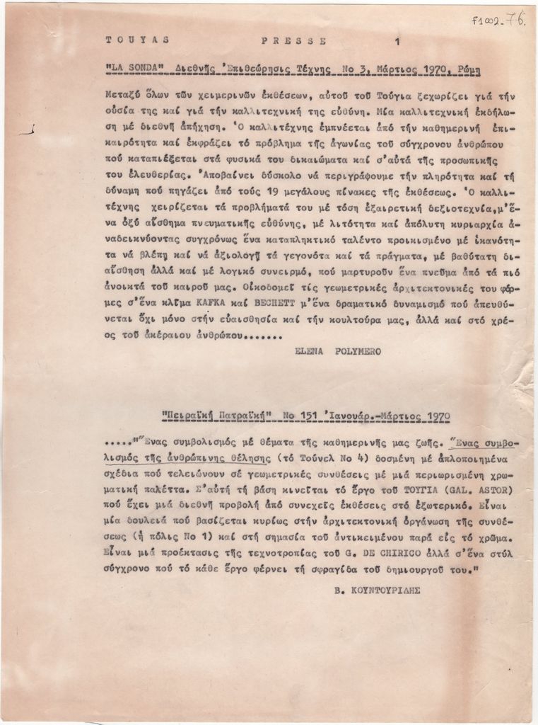 Κείμενο, δακτυλόγραφο, στα ελληνικά, σε χαρτί, 28,7×21,0 εκ. Αποδελτίωση αποσπάσματος της κριτικής της Έλενας Πολυμεροπούλου που δημοσιεύτηκε στα ιταλικά στην Διεθνή Επιθεώρηση Τέχνης La Sonda και αποσπάσματος της κριτικής του Βάσου Κουντουρίδη που δημοσιεύτηκε στο περιοδικό Πειραϊκή-Πατραϊκή για την ατομική έκθεση του Γιώργου Τούγια στην Αθήνα το 1970.