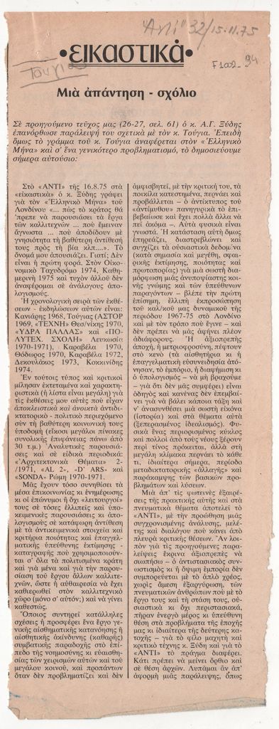 Αποκόμματα, έντυπα, χαρτί, 2 τμήματα, 28,0×10,5 εκ., όπου δημοσιεύεται, στα ελληνικά, ανοιχτή επιστολή του Γιώργου Τούγια για τον “Ελληνικό Μήνα” του Λονδίνου με αφορμή άρθρου του Α. Ξύδη. Επάνω, επιγραφή με τα στοιχεία της δημοσίευσης.