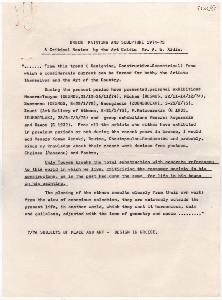 Κείμενο, δακτυλόγραφο, στα αγγλικά, χαρτί, 29,8×21,0 εκ. Αποδελτίωση αποσπάσματος άρθρου του Αλέξανδρου Ξύδη με τίτλο “Ελληνική ζωγραφική και γλυπτική 1974-1975” για τον Γιώργο Τούγια, που δημοσιεύτηκε στον ελληνικό περιοδικό τύπο το 1976.