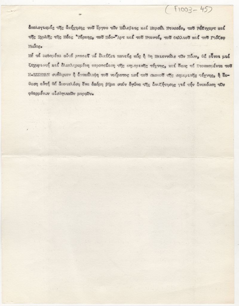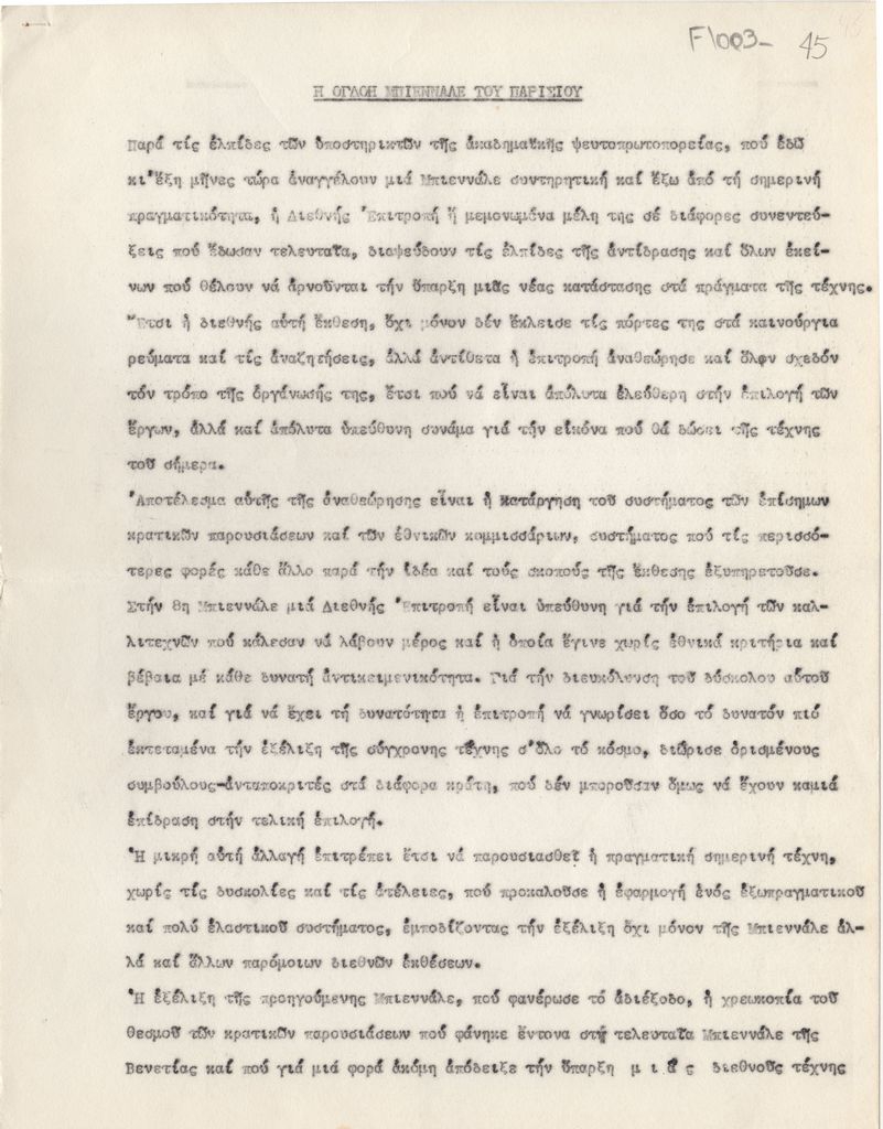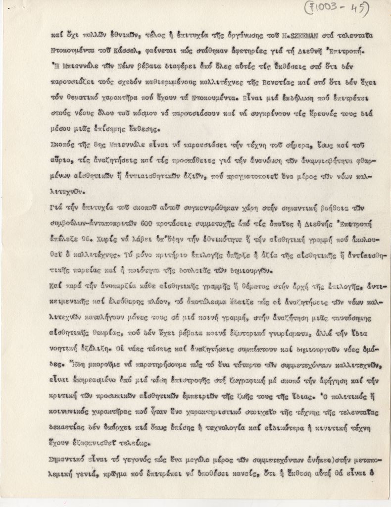 Κείμενο, δακτυλόγραφο, χαρτί, 3 φφ, 27×21 εκ., στα ελληνικά, αναφερόμενο στην Μπιεννάλε Νέων Παρισιού του 1973.
