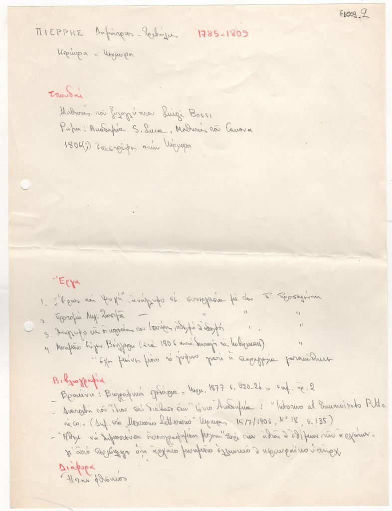 Κείμενο, χειρόγραφο, με μολύβι και κόκκινη ξυλομπογιά, στα ελληνικά, χαρτί, 28,5×21,5 εκ. Σημειώσεις βιογραφικού για τον γλύπτη Δημήτριο Τριβώλη Πιέρη. Αναφέρονται σπουδές, έργα και βιβλιογραφία.