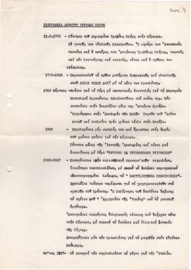 Κείμενο, δακτυλόγραφο, στα ελληνικά, χαρτί, 2 φφ., 21,8×21,0 εκ. Βιογραφικό του κερκυραίου γλύπτη Δημήτριου Τριβώλη Πιέρη οργανωμένο χρονολογικά.