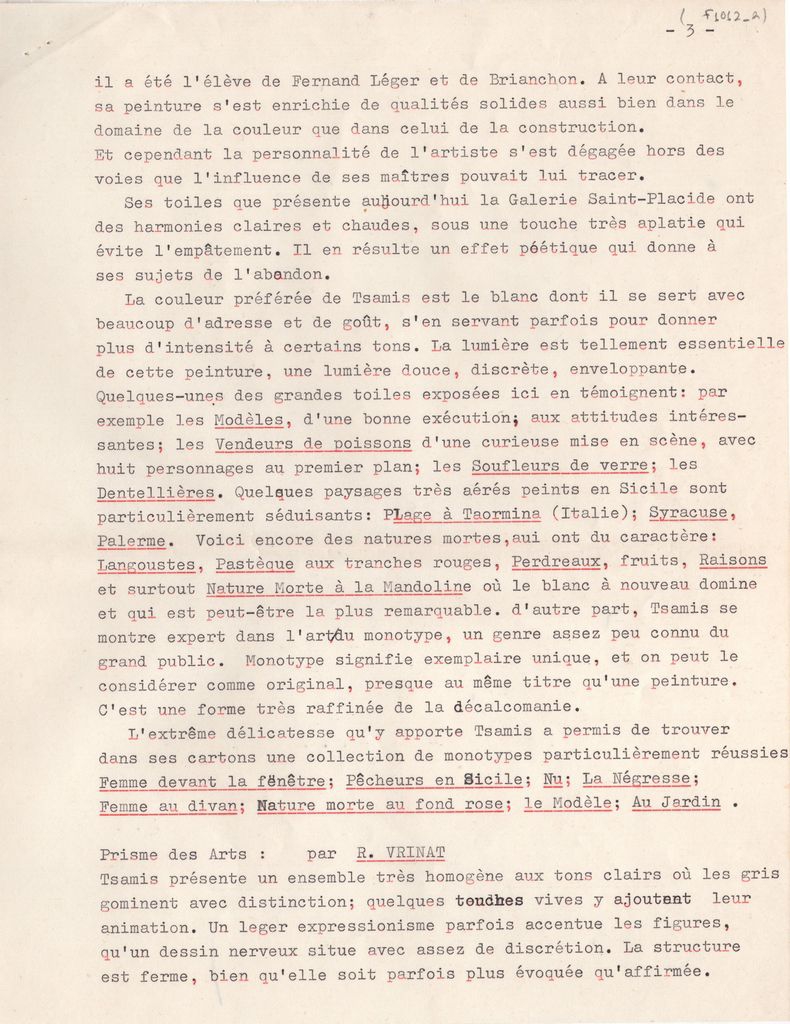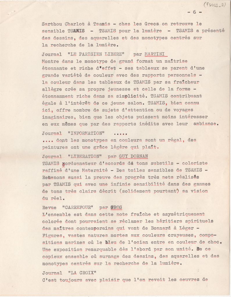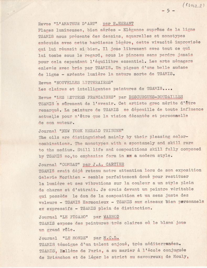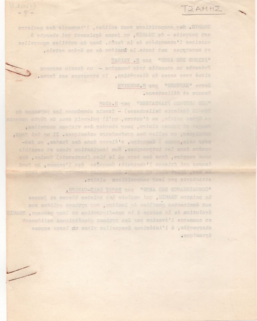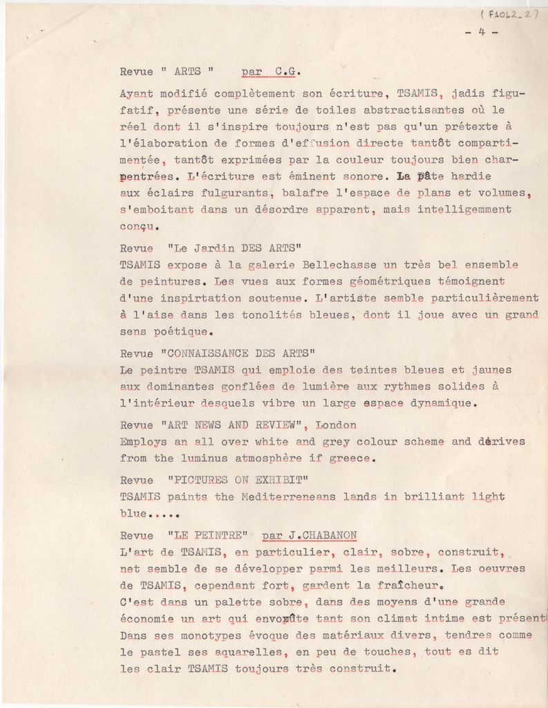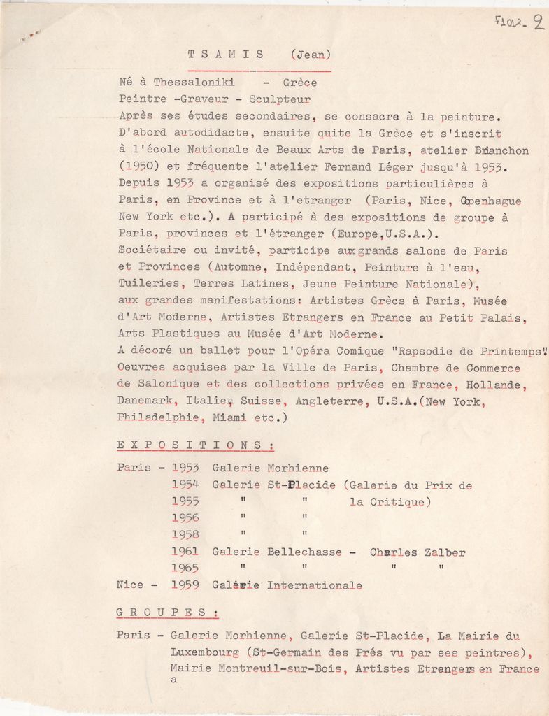 Κείμενο, δακτυλόγραφο, στα γαλλικά, σε χαρτί, 7 φφ, 27,0×21,0 εκ. Βιογραφικό σημείωμα του ζωγράφου και χαράκτη Γιάννη Τσάμη. Αναφέρονται σπουδές, καλλιτεχνική σταδιοδρομία, ατομικές και ομαδικές εκθέσεις και βιβλιογραφία και αποσπάσματα κριτικών από τον γαλλικό περιοδικό και αμερικανικό ημερήσιο τύπο.