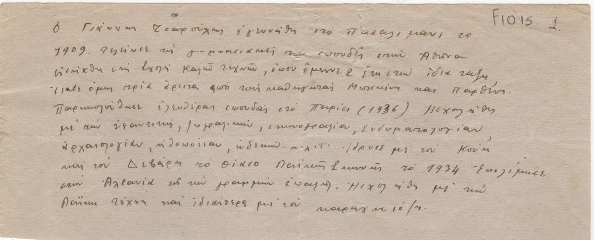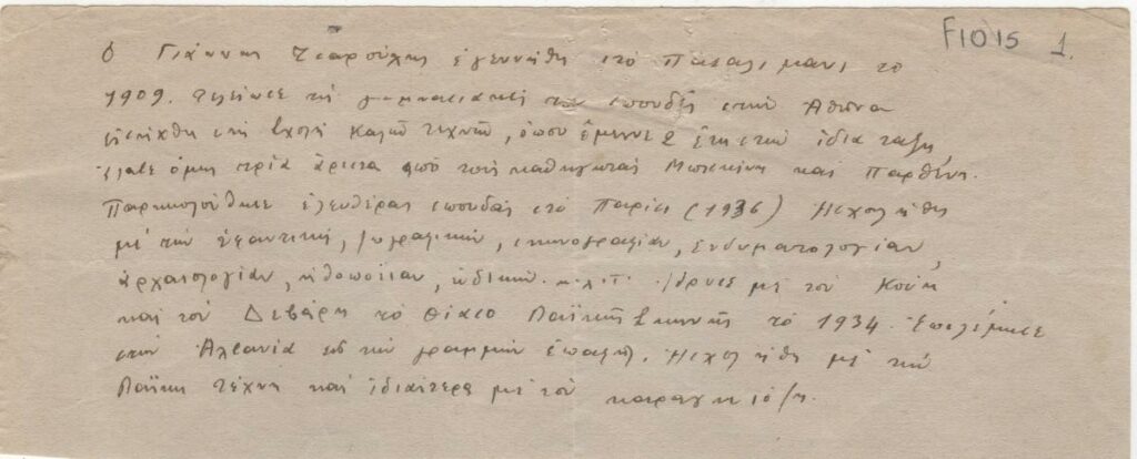 Βιογραφικό σημείωμα, χειρόγραφο, χαρτί, 8×20 εκ., στα ελληνικά, του Γιάννη Τσαρούχη.