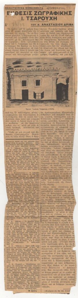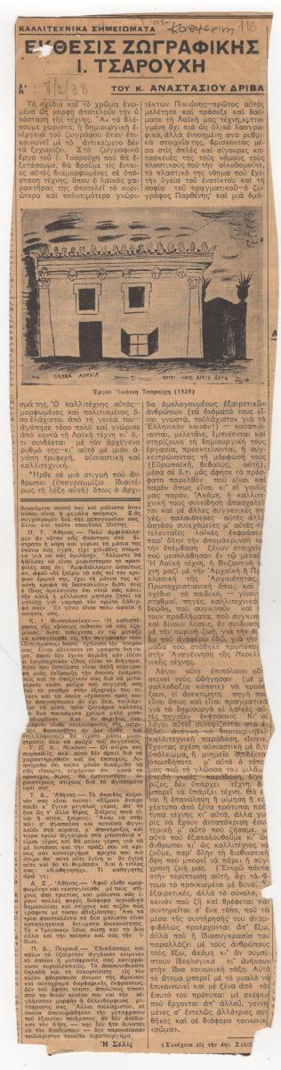 Απόκομμα της εφημερίδας “Η Καθημερινή” (07/02/1938) δημοσίευσης κριτικής έκθεσης ζωγραφικής του Γιάννη Τσαρούχη.