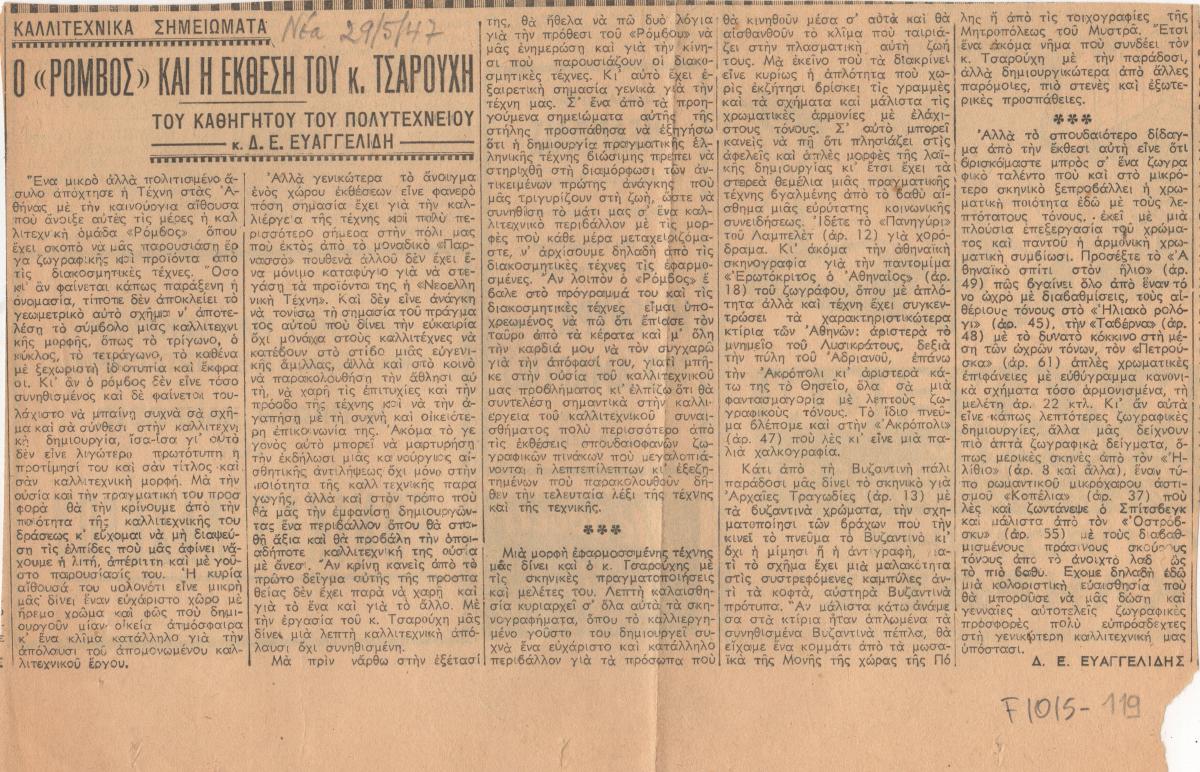 Απόκομμα της εφημερίδας “Τα Νέα” (29/05/1947), δημοσίευσης κριτικής έκθεσης του Γιάννη Τσαρούχη, η οποία διεξάγεται στην Γκαλερί Ρόμβος στην Αθήνα.