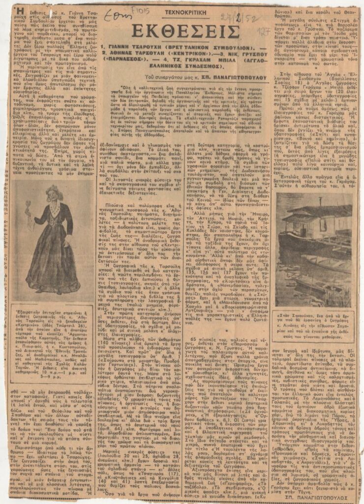 Απόκομμα της εφημερίδας “‘Εθνος” (27/02/1952), δημοσίευσης κριτικής εκθέσεων των Γιάννη Τσαρούχη στο Βρετανικό Συμβούλιο, Αθηνάς Ταρσούλη στην αίθουσα Κεντρικον, Νικήτα Γρύσπου, στον Φιλολογικό Σύλλογο Παρνασσό, J. Graham Bill στον Αγγλοελληνικό Σύνδεσμο.