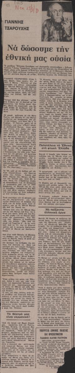 Απόκομμα της εφημερίδας ‘Τα Νέα” (25/09/1979), δημοσίευσης κειμένου του Γιάννη Τσαρούχη, στο οποίο γράφει τις απόψεις του για το νεοελληνικό θέατρο.