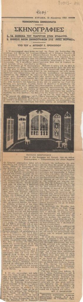 Απόκομμα της εφημερίδας “Η Καθημερινή” (13/08/1961), δημοσίευσης κριτικής της σκηνογραφικής δραστηριότητας του Γιάννη Τσαρούχη και ομάδας νέων καλλιτεχνών. Ειδικότερα, σχολιάζονται τα σκηνικά του Τσαρούχη για τη “Μήδεια” που ανέβηκε στην Επίδαυρο και ομαδική έκθεση νέων σκηνογράφων στην γκαλερί Νέες Μορφές.