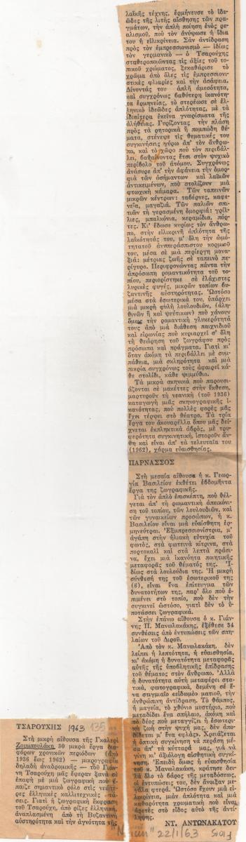Απόκομμα της εφημερίδας “Η Νίκη” (22/01/1963), δημοσίευσης κριτικής εκθέσεων των Γιάννη Τσαρούχη, Γεωργίας Βασιλείου και Γιάννη Μανωλακάκη.