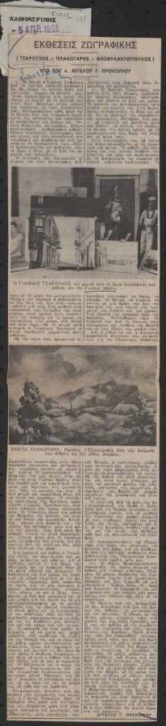 Απόκομμα της εφημερίδας “Η Καθημερινή” (05/04/1966), δημοσίευσης κριτικής εκθέσεων των Γιάννη Τσαρούχη, στην γκαλερί Μέρλιν, Κώστα Πλακωτάρη στις Νέες Μορφές και του Μάκη Θεοφυλακτόπουλου στην γκαλερί Άστορ.