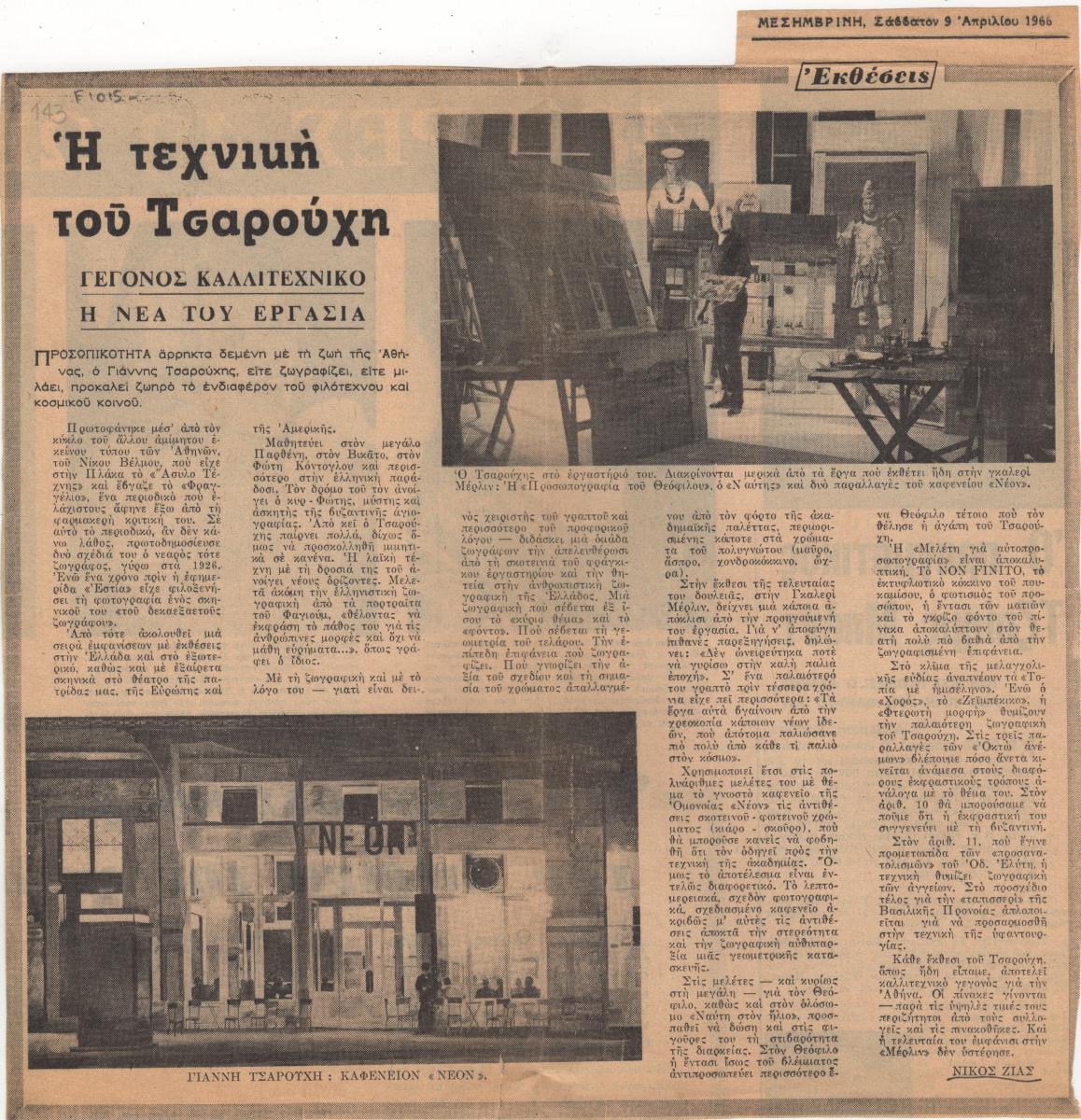 Απόκομμα της εφημερίδας “Μεσημβρινή” (09/04/1966), δημοσίευσης κριτικής έκθεσης του Γιάννη Τσαρούχη, η οποία διεξάγεται στην γκαλερί Μέρλιν στην Αθήνα.