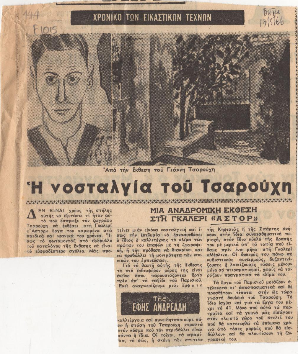 Απόκομμα της εφημερίδας “Το Βήμα” (13/05/1966), δημοσίευσης κριτικής έκθεσης του Γιάννη Τσαρούχη η οποία διεξάγεται στην γκαλερί Άστορ στην Αθήνα, όπου παρουσιάζει έργα των νεανικών χρόνων του.