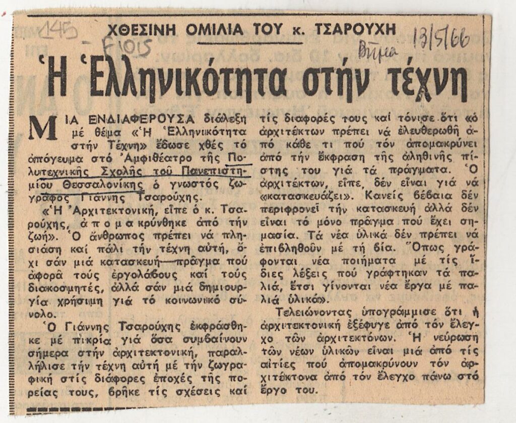Απόκομμα της εφημερίδας “Το Βήμα” (13/05/1966), δημοσίευσης άρθρου αναφερόμενου σε ομιλία του Γιάννη Τσαρούχη με θέμα την “Ελληνικότητα στην Τέχνη”, στην Πολυτεχνική Σχολή του Αριστοτελείου Πανεπιστημίου Θεσσαλονίκης.
