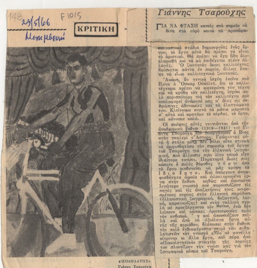 Απόκομμα της εφημερίδας “Μεσημβρινή” (23/05/1966), δημοσίευσης κριτικής έκθεσης του Γιάννη Τσαρούχη, η οποία διεξάγεται στην Γκαλερί Άστορ στην Αθήνα.