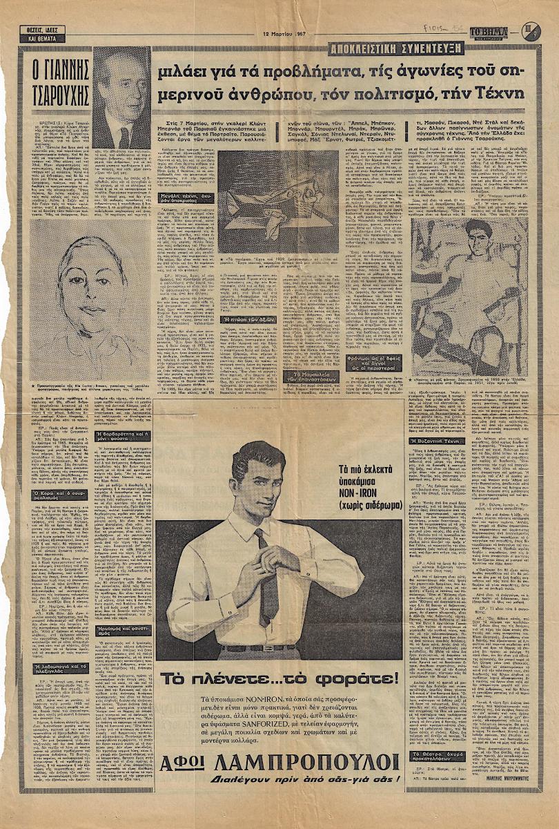 Απόκομμα της εφημερίδας “Το Βήμα” (12/03/1967) συνέντευξης του Γιάννη Τσαρούχη, στην οποία απαντά σε ερωτήματα για την Τέχνη, την κοινωνία, τον πολιτισμό.
