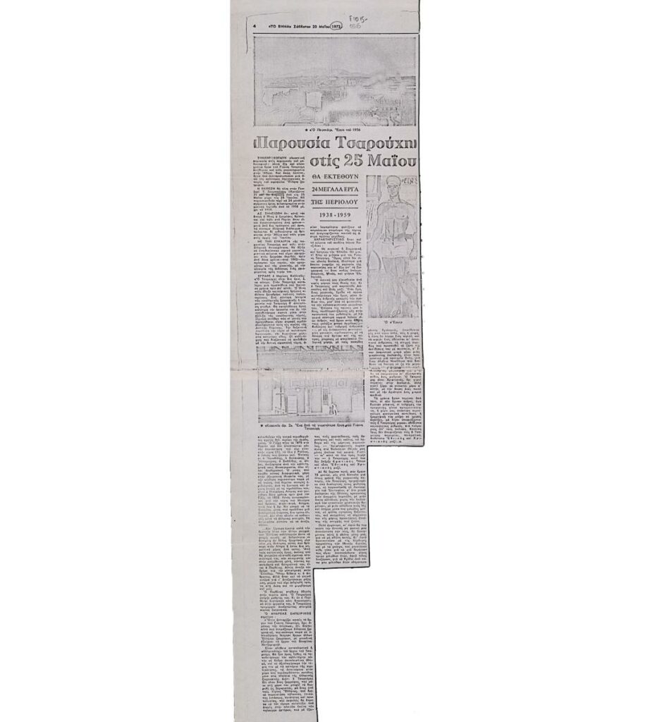Φωτοαντίγραφο, χαρτί, στα ελληνικά, δημοσίευσης κριτικής έκθεσης του Γιάννη Τσαρούχη, η οποία διεξάγεται στην γκαλερί Ζουμπουλάκη στην Αθήνα.