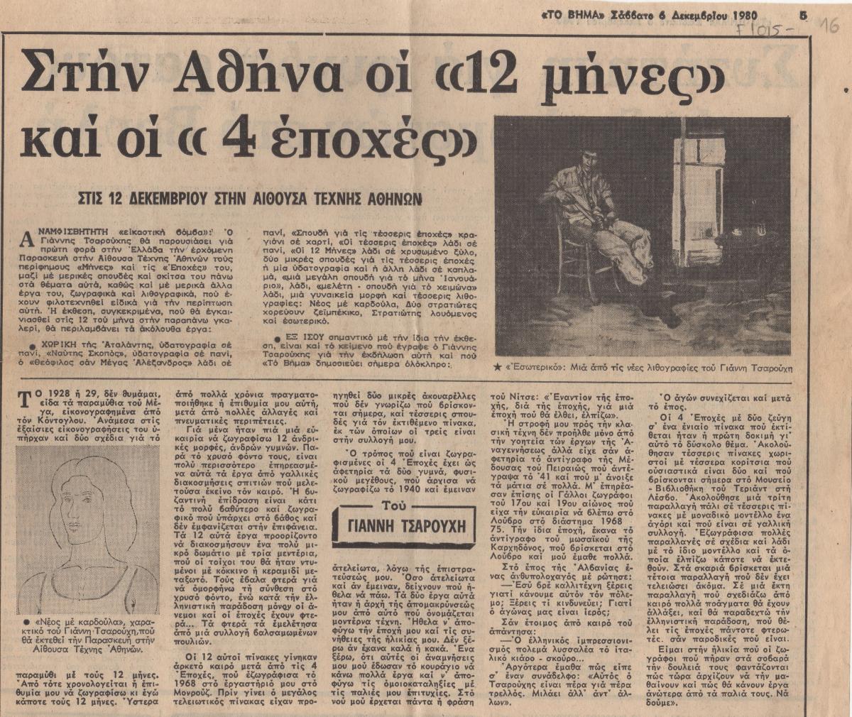 Απόκομμα της εφημερίδας “Το Βήμα” (06/12/1980), όπου δημοσιεύεται άρθρο με θέμα την έκθεση έργων του Γιάννη Τσαρούχη με τίτλο “Μήνες και Εποχές” που επρόκειτο να διεξαχθεί στην Αίθουσα Τέχνης Αθηνών. Δημοσιεύεται κείμενο του καλλιτέχνη για το έργο του.