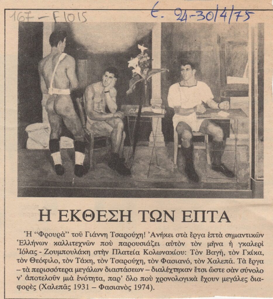 Απόκομμα του περιοδικού “Επίκαιρα” (24/04/1975), όπου δημοσιεύεται αναγγελία έκθεσης έργων επτά Ελλήνων καλλιτεχνών στην γκαλερί Ζουμπουλάκη στην Αθήνα. Πρόκειται για τους Βαγή, Γκίκα, Θεόφιλο, Τάκη, Τσαρούχη, Φασιανο, Χαλεπά.