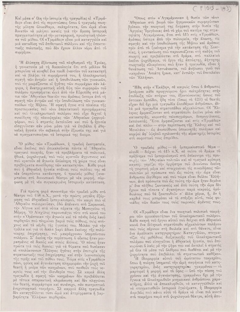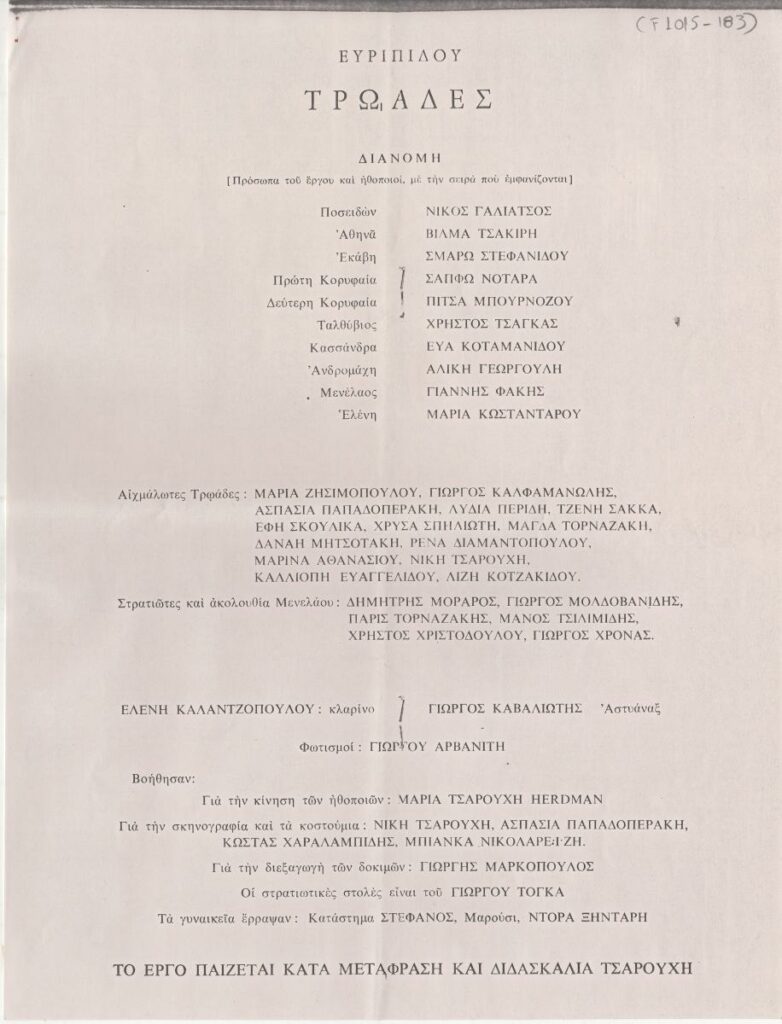 Φωτοαντίγραφο, χαρτί, 8 φφ, στα ελληνικά, προγράμματος της θεατρικής παράστασης “Τρωάδες” του Ευριπίδη, στο θεάτρο της Οδού Καπλάνων 6 στην Αθήνα, σε σκηνοθεσία Γιάννη Τσαρούχη.