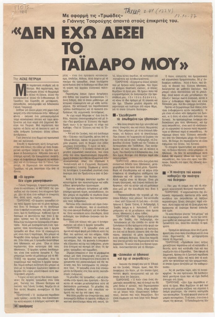 Απόκομμα του περιοδικού “Ο Ταχυδρόμος”, τεύχος 41 (13/10/1977), όπου δημοσιεύεται συνέντευξη του Γιάννη Τσαρούχη, με αφορμή την παράστασή του “Τρωάδες” που ανεβάζει στην Αθήνα. Ο καλλιτέχνης μιλά για τη σκηνοθεσία της παράστασης, απαντά στους επικριτές του ενώ σχολιάζει τη θεατρική κίνηση και πραγματικότητα.