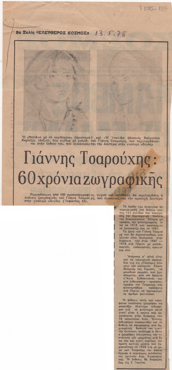 Απόκομμα της εφημερίδας “Ελεύθερος Κόσμος” (13/05/1978), όπου δημοσιεύεται αναγγελία της έκθεσης του Γιάννη Τσαρούχη στην Γκαλερί Ζυγός στην Αθήνα.