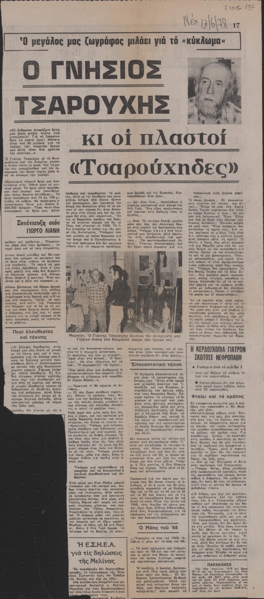 Απόκομμα της εφημερίδας “Τα Νέα” (13/06/1978), όπου δημοσιεύεται συνέντευξη του Γιάννη Τσαρούχη. Ο καλλιτέχνης μιλά μεταξύ άλλων για τη διακίνηση πλαστογραφημένων έργων του.