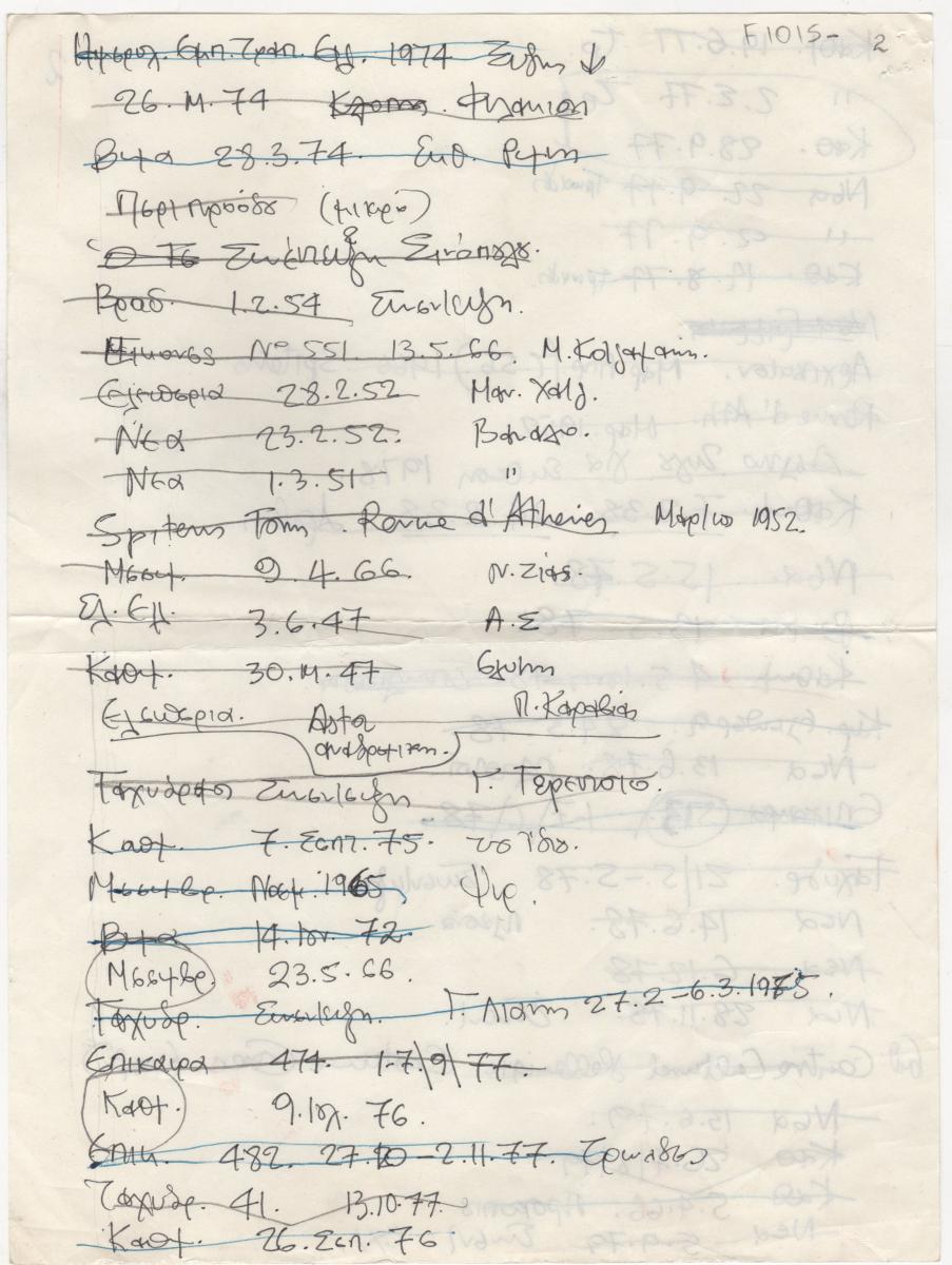 Βιβλιογραφία, χειρόγραφη, χαρτί, 2 φφ, 29,5×21 εκ., στα ελληνικά, του Γιάννη Τσαρούχη. Αναγράφονται πληροφορίες δημοσιεύεσεων για τον καλλιτέχνη στον ελληνικό και διεθνή Τύπο.