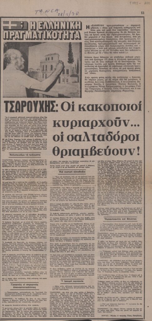 Απόκομμα της εφημερίδας “Τα Νέα” (28/11/1978), όπου δημοσιεύεται έρευνα του εντύπου αναφορικά με την ελληνική πραγματικότητα. Στο παρόν παρατίθενται οι απαντήσεις του Γιάννη Τσαρούχη σε σχετικά ερωτήματα.