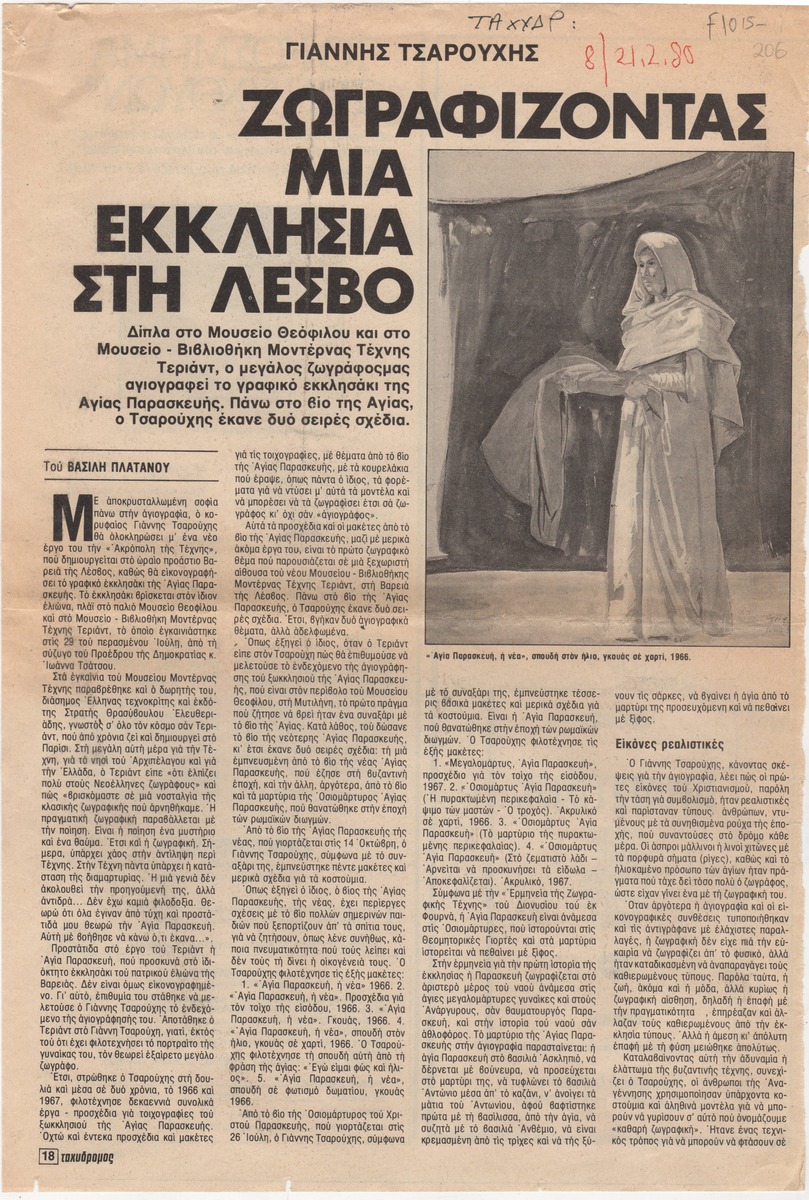 Απόκομμα του περιοδικού “Ο Ταχυδρόμος”, τεύχος 8 (21/02/1980), όπου δημοσιεύεται άρθρο με θέμα την αγιογράφηση από τον Γιάννη Τσαρούχη, σε εκκλησάκι της Αγίας Παρασκευής.