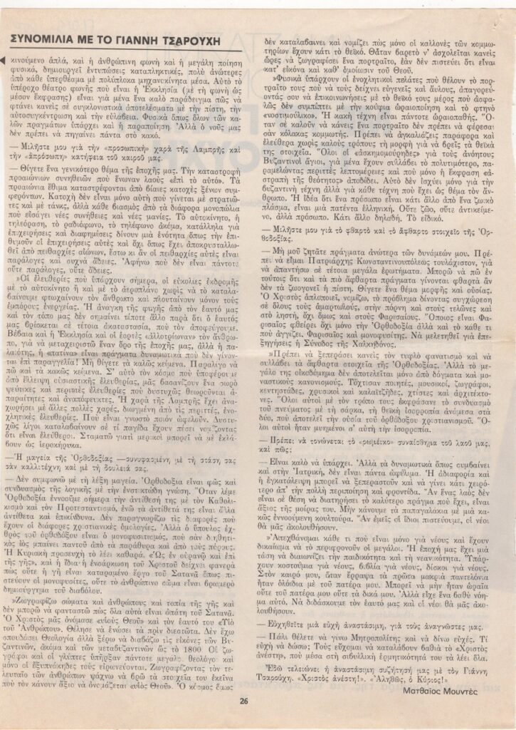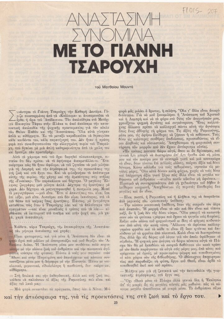 Απόκομμα του περιοδικού “Ο Ταχυδρόμος”, τεύχος 788 (26/03/1980), όπου δημοσιεύεται συνέντευξη του Γιάννη Τσαρούχη με τον Ματθαίο Μουντέ. Ο καλλιτέχνης μιλά για την Ανάσταση, για τη Λαμπρή και Ορθοδοξία.