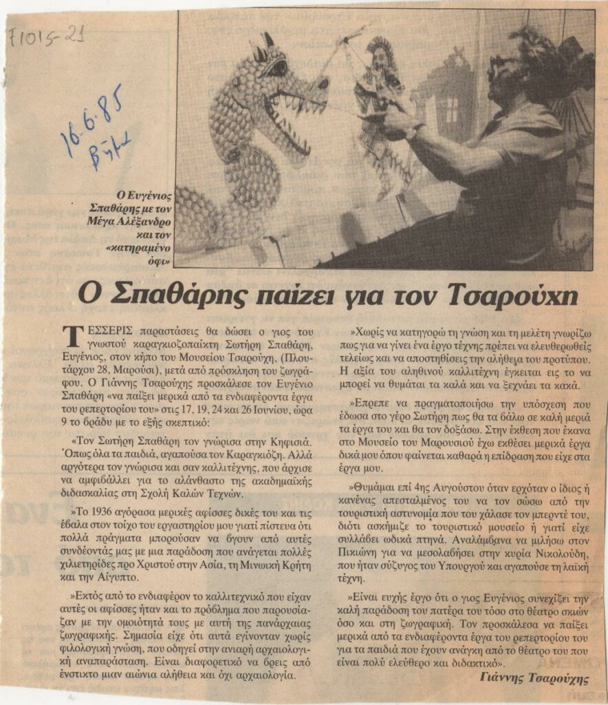 Απόκομμα της εφημερίδας “Το Βήμα” (16/05/1985), όπου δημοσιεύεται άρθρο του Γιάννη Τσαρούχη. Ο καλλιτέχνης αναφέρεται σε παραστάσεις καραγκιόζη του Ευγένιου Σπαθάρη, που θα πραγματοποιηθούν στο Μουσείο Τσαρούχη στην Αθήνα. Ο Τσαρούχης αναφέρεται στη γνωριμία και εκτίμηση που τρέφει στην οικογένεια Σπαθάρη.