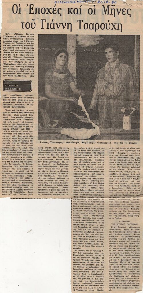 Απόκομμα της εφημερίδας “Ελεύθερος Κόσμος” (21/12/1980), όπου δημοσιεύεται κριτική έκθεσης του Γιάννη Τσαρούχη, η οποία διεξάγεται στην Αίθουσα Τέχνης Αθηνών.