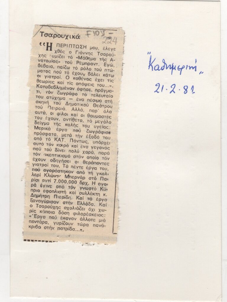 Απόκομμα της εφημερίδας “Η Καθημερινή” (21/02/1981), όπου δημοσιεύεται άρθρο με θέμα το ατύχημα του Γιάννη Τσαρούχη, ύστερα από πτώση του στο Δημοτικό Θέατρο Πειραιά.